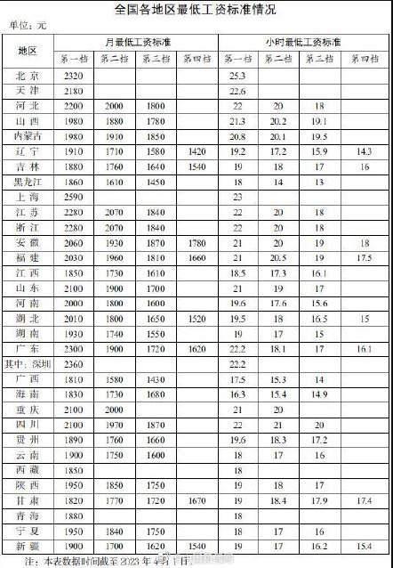 2023年最新最低工資表公布!
