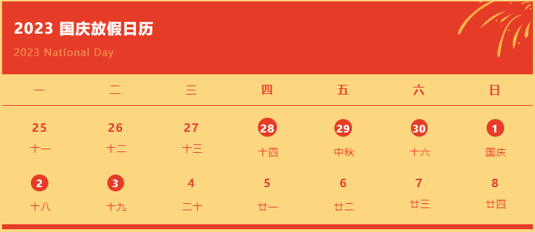 一年一度的中秋國(guó)慶節(jié)將至,根據(jù)《國(guó)務(wù)院辦公廳關(guān)于 2023 年部分節(jié)假日安排的通知》的消息,結(jié)合公司的實(shí)際情況,現(xiàn)將今年中秋節(jié)國(guó)慶節(jié)放假相關(guān)事宜通知如下: